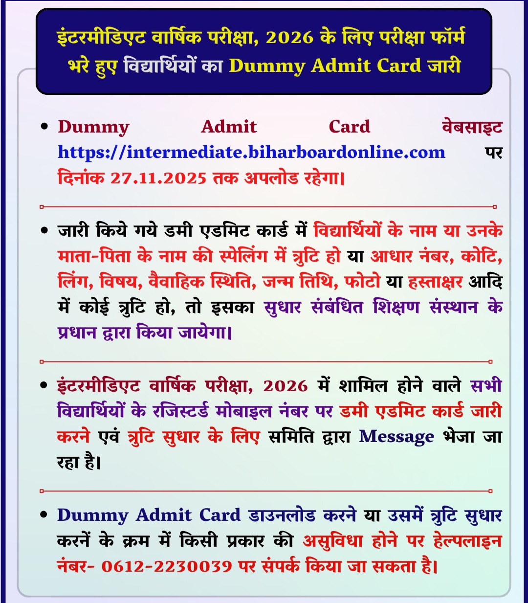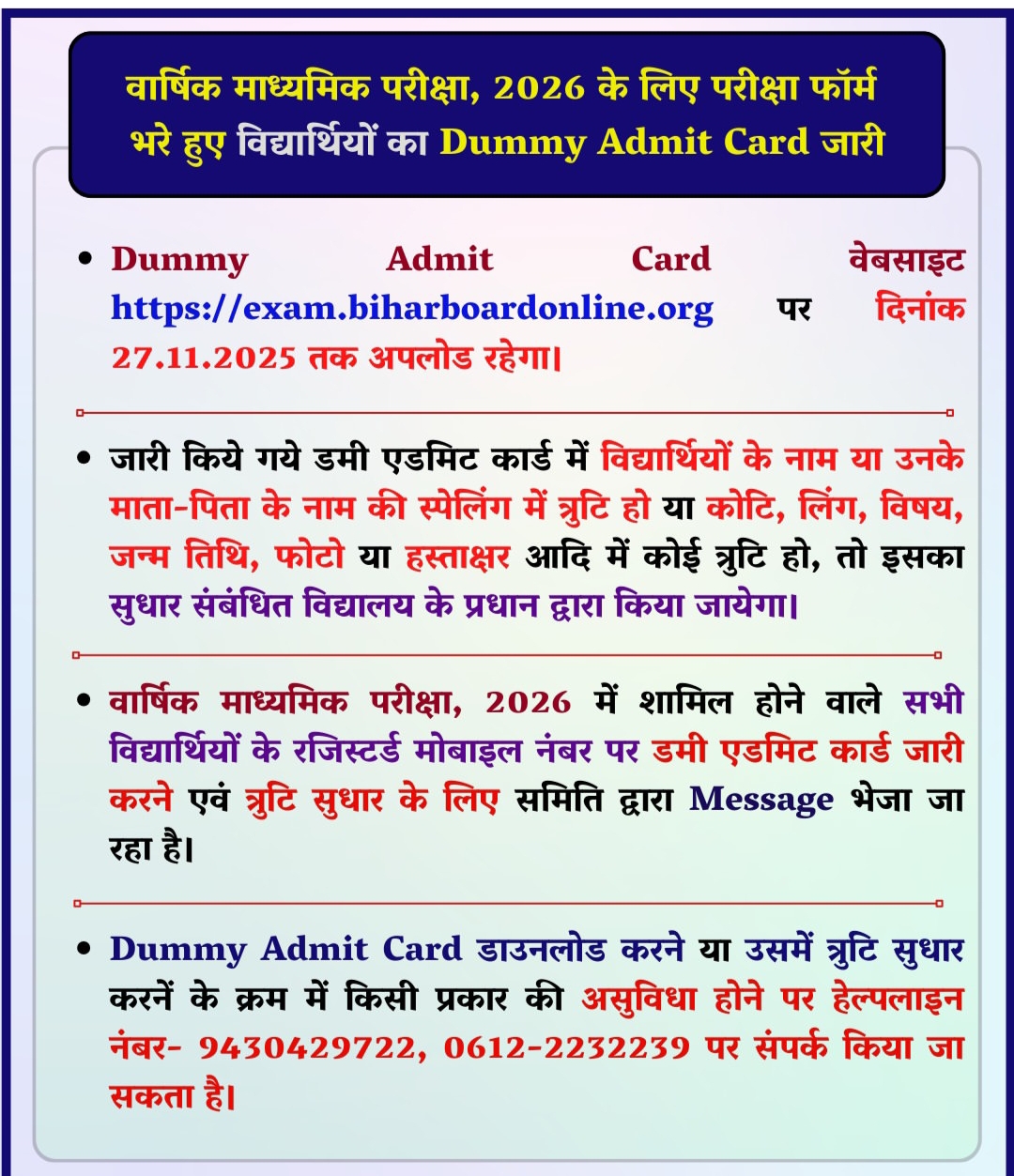 एतद् द्वारा राज्य के माध्यमिक स्तर के सभी मान्यता प्राप्त विद्यालयों के प्रधान, वार्षिक माध्यमिक परीक्षा, 2026 में सम्मिलित होने वाले सभी छात्र/छात्रा, उनके अभिभावक, सभी जिला कार्यक्रम पदाधिकारी (माध्यमिक) एवं सभी जिला शिक्षा पदाधिकारी को सूचित किया जाता है कि वार्षिक माध्यमिक परीक्षा, 2026 में सम्मिलित होने हेतु ऑनलाईन भरे गये पंजीयन एवं परीक्षा आवेदन के आधार पर छात्र/छात्राओं का Dummy Admit Card समिति की वेबसाईट https://exam.biharboardonline. org पर अपलोड किया गया है, जो दिनांक 27.11.2025 तक त्रुटि सुधार हेतु उपलब्ध रहेगा।